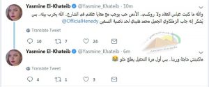 وكتبت ياسمين الخطيب تغريدة على “تويتر”: “والله ما كتبت عباس العقاد ولا روكسي.. الأدمن حب يوجب مع معايا علقني في الشارع.. الله يخرب بيته.. بس يُشكر أنه جاب الزملكاوي الجميل محمد هنيدي لحد ناصية التسعين”، مضيفة: “ما كتبتش حاجة وربنا.. بس أول مرة التحفيل يطلع حلو”.