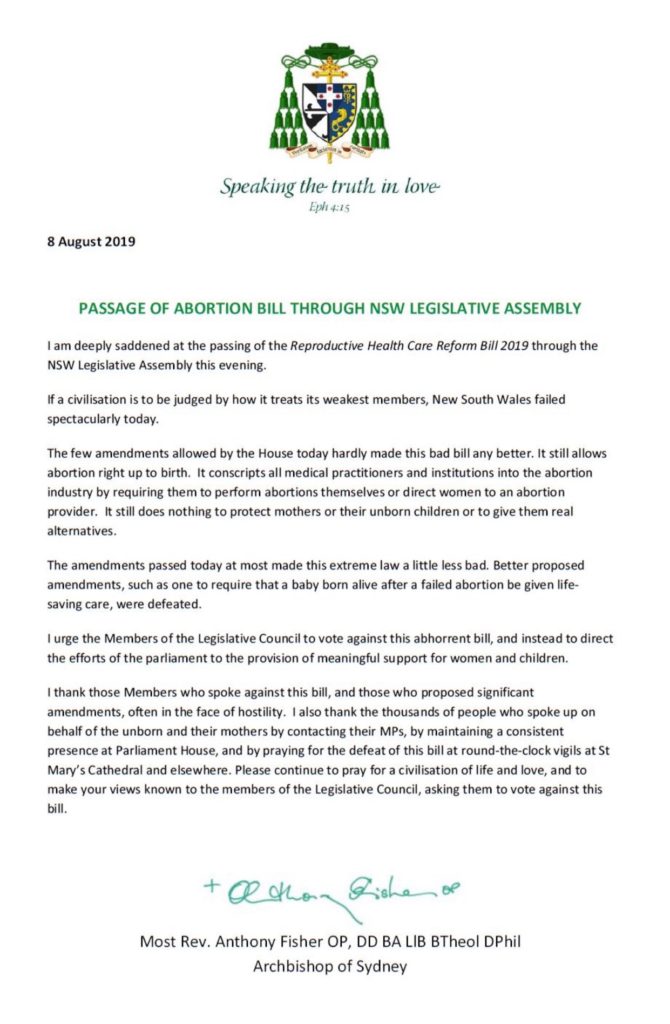 أصدر أمس الخميس ٨ أغسطس الانبا أنتوتى فيشر مطران ورئيس أساقفة الكنيسة الكاثوليكية بسيدنى بياناً شديد اللهجة أدان فيه برلمان حكومة نيو ساوث ويلز الذى قام بتمرير مشروع قانون الإجهاض الجديد وتسبب فى صدمة قوية لابناء الكنيسة بعد ان جاء التصويت لقتل الأجنة حتى قبل ولادتهم بالتزامن مع الاحتفال بعيد القديسة مارى ماكيلب اول قديسة أسترالية عملت على العناية والاهتمام بالاطفال , وقد قدم فيشر الشكر لأعضاء البرلمان الذين رفضوا القانون ومئات الالاف الذين طالبوا برفضه كما ناشد أعضاء مجلس الشيوخ برفض مشروع القانون اثناء التصويت عليه فى وقت لاحق .