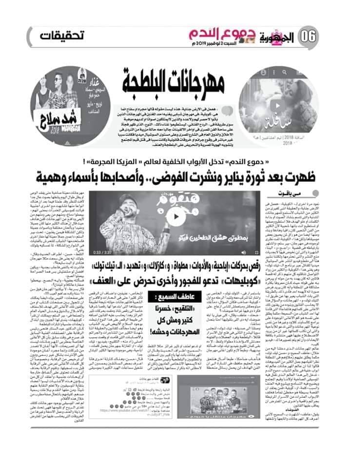 في باب دموع الندم بجريدة الجمهورية حول مشاكل مطربي المهرجانات.