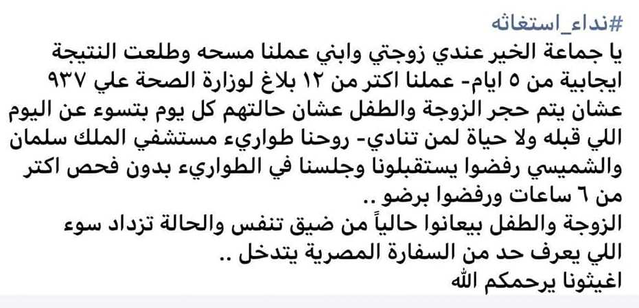 بنشر شكوى لمغترب مصرى يستغيث بعد إصابة زوجته وابنه بكورونا