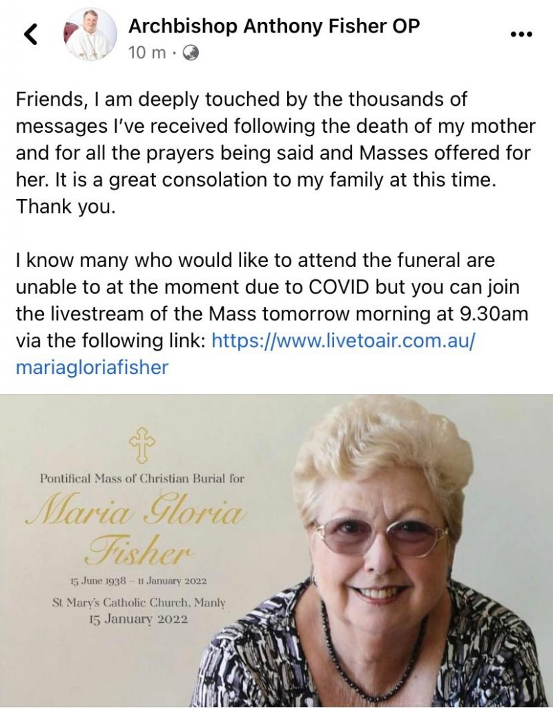 رقدت فى الرب يوم الثلاثاء الماضى الموافق ١١ يناير ٢٠٢٢ ، السيدة الفاضلة ماريا جلوريا فيشر عن عمر يناهز ٨٤ عام ، زوجة السيد كولين فيشر ووالدة كل من نيافة الحبر الجليل الأنبا أنتونى فيشر رئيس أساقفة الكنيسة الكاثوليكية بمدينة سيدنى عاصمة ولاية نيو ساوث ويلز فى أستراليا وأخوته كريستوفر ، أنجيلا ، لويز وجريجرى