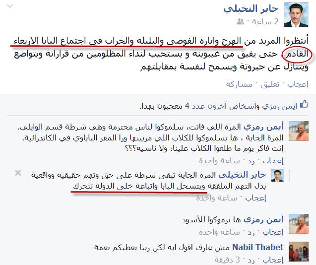 كتب أحد منكوبى الأحوال الشخصية على صفحته الشخصية ويدعى جابر النخيلى قائلا ، أنتظروا المزيد من الفوضى والبلبة والخراب فى أجتماع البابا الأربعاء القادم حتى يفيق من غيبوبته ويستجيب لنداء المظلومين ويتواضع ويتنازل عن جبروته ويسمح لنفسه بمقابلتهم .