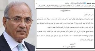يذكر ان الفريق أحمد شفيق المرشح السابق لرئاسة الجمهورية، والمتواجد الآن بالإمارات، قد اصدر بياناً شديد اللهجة يعلق فيه على الأحداث السيئة التي تمر بها مصر، والأزمات التي تعيشها مصر، وذلك ابتداءً من أزمة سد النهضة الي ارجاع الجزيرتين للسعودية ، كما تعرض ‘شفيق’ الي انتقادات بعد اثارة الجدل حول بيانة اليوم.