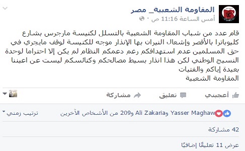 قال منشور على الصفحة الرسمية للحركة المسماة بـ”المقاومة الشعبية” والمصنفة ضمن اللجان النوعية لجماعة الإخوان إن عدد من شباب الحركة تسللوا للكنيسة وأشعلوا النيران بها، مهددين بمزيد من الاستهداف للأقباط خلال الفترة المقبلة.