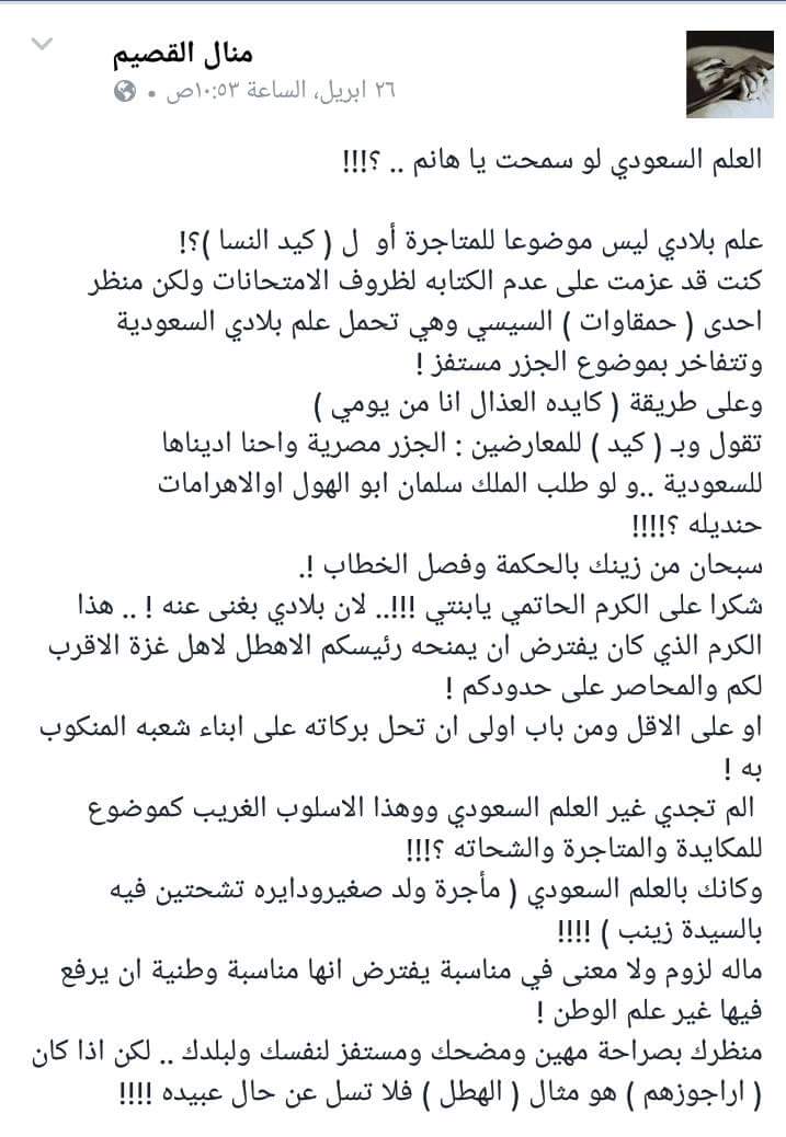 الرسالة التى قامت بكتابتها فتاة سعودية تعليقا على مافعلته سيدة مصرية من رفع العلم السعودى، رسالة مؤلمة لكل مصرى ومحزنه فى نفس الوقت كيف وصل المصريين الى هذا الحد ، من سمح برفع علم دولة أخرى غير علم مصرى واليكم ما كتبته الفتاة السعودية منال القصيم على صفحته على الفيس بوك حيث قالت ” لو سمحت يا هانم .. ؟! علم بلادي ليس موضوعا للمتاجرة او ل ( كيد النساء ) كنت قد عزمت على عدم الكتابه لظروف الامتحانات ولكن منظر احدى ( حمقاوات ) السيسي وهي تحمل علم بلادي السعودية وتتفاخر بموضوع الجزر مستفز ! وعلى طريقة ( كايده العذال انا من يومي ) تقول وبـ ( كيد ) للمعارضين : الجزر مصرية واحنا اديناها للسعودية ..و لو طلب الملك سلمان ابو الهول او الأهرامات حنديله ؟! سبحان من زينك بالحكمة وفصل الخطاب !. شكرا على الكرم الحاتمي يابنتي لان بلادي بغنى عنه ! .. هذا الكرم الذي كان يفترض ان يمنحه رئيسكم لأهل غزة الأقرب لكم والمحاصر على حدودكم ! او على الاقل ومن باب اولى ان تحل بركاته على أبناء شعبه المنكوب به ! الم تجدي غير العلم السعودي وهذا الأسلوب الغريب كموضوع للمكايدة والمتاجرة والشحاته ؟! وكانك بالعلم السعودي ( مأجرة ولد صغير وتشحتين فيه بالسيدة زينب ) ليس له لزوم ولا معنى في مناسبة يفترض انها مناسبة وطنية لا يرفع فيها غير علم الوطن ! منظرك بصراحة مهين ومضحك ومستفز لنفسك ولبلدك .. لكن اذا كان ( اراجوزهم ) هو مثال ( الهطل ) فلا تسأل عن حال عبيده !