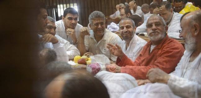 وقبل بدء الجلسة التقط بديع والعريان والبلتاجي صورا تذكارية داخل القفص، وفي ذلك الأثناء اقترب متهم يحمل كوبا من الزبادي، وبدأ في إطعام “بديع” منها.