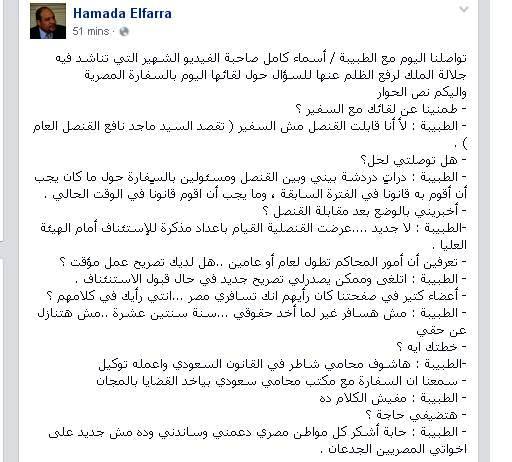 تواصل زميلنا الصحفى بالرياض حماده الفرا مع الطبيبة المصرية بعد مقابلة القنصل العام وأجرى معاها هذا الحوار عبر الهاتف