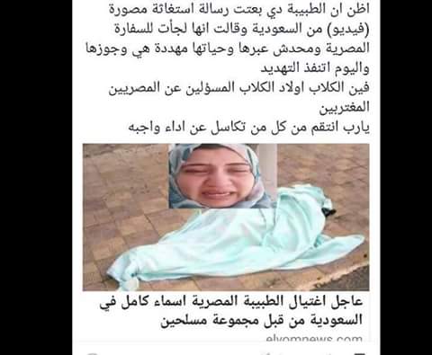 قامت الأهرام وعلى أسبوعين تدافع عن الطبيبة المصرية أسماء عبد الفتاح وحقها ، وقمنا بإجراء حوار معاها ، ولكن فوجئنا منذ اسبوع من يروج لشائعة مغرضة حول مقتل الطبيب المصرية على يد مسلحين ، حيث تداول رواد مواقع التواصل الاجتماعي، انباء بشأن مقتل الطبيبة المصرية، أسماء عبد الفتاح كامل، والتي تعمل بمجمع طبي أم السالك بالمنطقة الشرقية، على يد مسلحين في المملكة العربية السعودية، وذلك على خلفية الأزمة بينها وبين الكفيل السعودي.