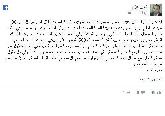 وقال “عزام” في تدوينة عبر حسابه بـ”فيس بوك”: “أعتقد بعد انتهاء إجازة عيد الأضحى مباشرة سيتم تخفيض قيمة العملة المحلية خلال الفترة من 15 الي 30 سبتمبر القادم فبعد إقرار قانون ضريبة القيمة المضافة أصبحت خزائن البنك المركزي المصري في حالة تأهب لإستقبال مليار دولار امريكي من قرض البنك الدولي المتفق سابقا بعد أن استوفت مصر شرط البنك الدولي بإقرار وتطبيق قانون ضريبة القيمة المضافة”.