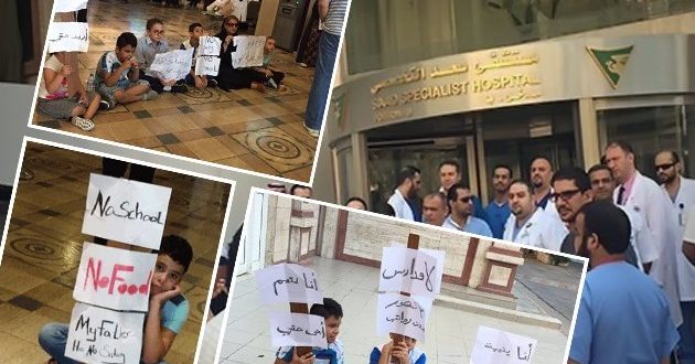 تسبب تأخّر الرواتب في مستشفى سعد التخصصي في مدينة الخبر أحد أكبر المستشفيات التخصصية في المنطقة الشرقية، في تكرار إضراب موظفي المستشفى من الكادرين الصحي والإداري عن العمل، ووقعت مشادات كلامية واشتباكات بالأيدي بين العاملين في المستشفى وحراس الأمن، أمس، بعد أن انتزع أمن المستشفى لافتات المحتجين الذين عبروا من خلالها عن معاناتهم وسوء أحوالهم بسبب تأخر رواتبهم لأكثر من ثلاثة وأربعة أشهر متواصلة، وناشد موظفو المستشفى الجهات المختصة بالتدخل السريع وحل أزمة رواتبهم نظرًا لما يعانيه بعضهم من ظروف مادية قاسية.