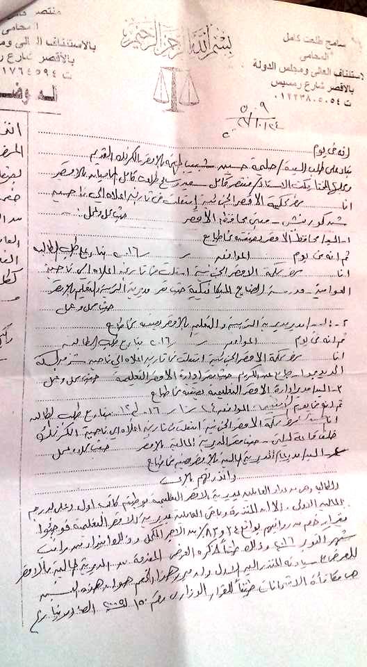 وتقوم الأهرام بنشر صورة من خطاب المديرية المالية بالأقصر إلى مدير عام التربية والتعليم بالأقصر بعدم خصم نسبة إل 83.34% من مرتبات العاملين بمديرية التربية والتعليم بالأقصر واداراتها وذلك ابتداء من شهر أكتوبر الجارى ، لحين الفصل فى الدعوى رقم 596 لسنة 3 ق إدارية الاقصر ..