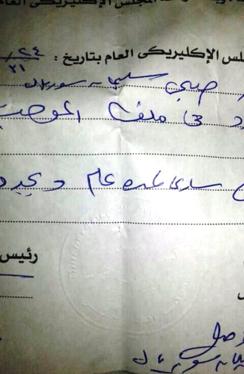 وهنا كما وعدتكم أنشر لكم النسخة الاصلية من التصريح بالزواج و التى استلمتها أمس الاثنين الموافق 31 أكتوبر 2016 من المجلس الاكليريكى العام و من يد نيافة الحبر الجليل الانبا دانيال رئيس المجلس الاكليريكى العام
