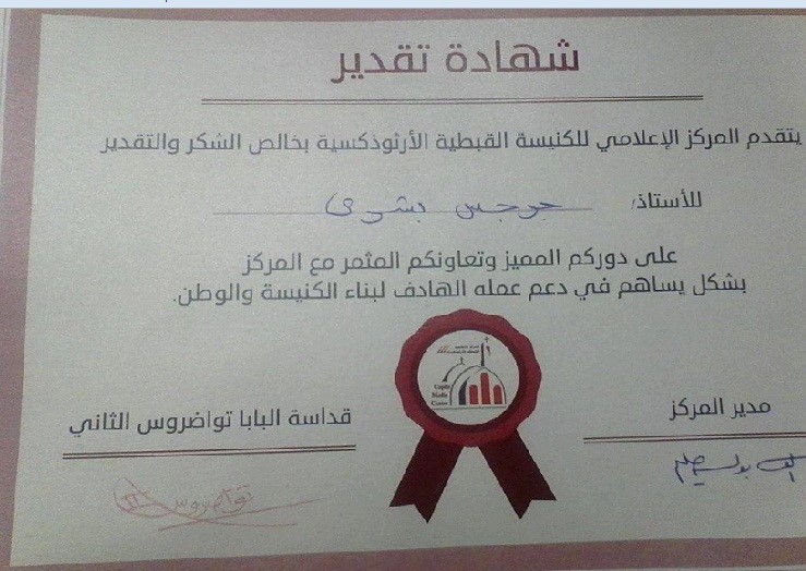اخبار المركزبمهنية وموضوعية والتعاون المثمر مع المركز ودعم دوره في القيام بدوره في خدمة الوطن والكنيسة ، وقد استلم شهادة التقدير نيابةعنه الزميل ” محمد يوسف ” بسبب عدم تمكنه من حضور الحفل لظرف طارئ ،