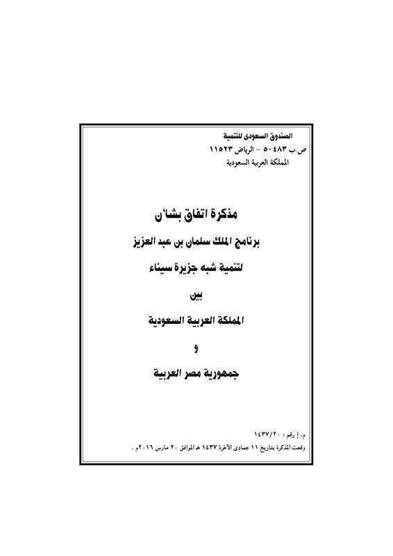 نشرت الجريدة الرسمية اليوم الخميس، بالعدد 4، قرار عبد الفتاح السيسي رقم 181 لسنة 2016، بالموافقة على مذكرة الاتفاق بشأن برنامج العاهل السعودي الملك سلمان بن عبد العزيز، لتنمية شبه جزيرة سيناء، الموقعة في الرياض بتاريخ 20 مارس 2016 بين الحكومتين المصرية والسعودية.