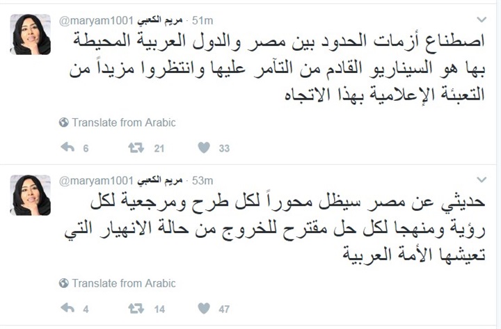 وقالت مريم الكعبي في تغريدة على تويتر: «حديثي عن مصر سيظل محورًا لكل طرح ومرجعية لكل رؤية ومنهجا لكل حل مقترح للخروج من حالة الانهيار التي تعيشها الأمة العربية».