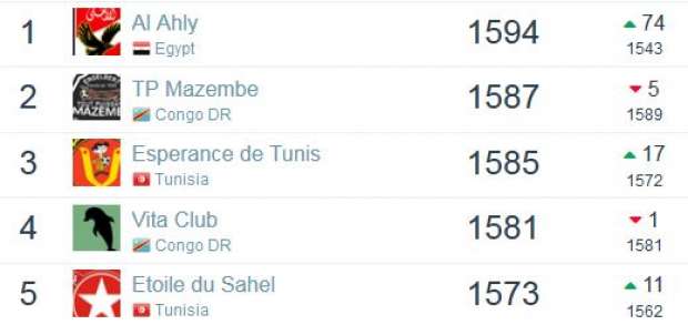 وجاء النادي الأهلي في صدارة ترتيب أندية إفريقيا برصيد 1594 نقطة، فيما جاء نادي الزمالك في المركز الثامن برصيد 1536 نقطة.