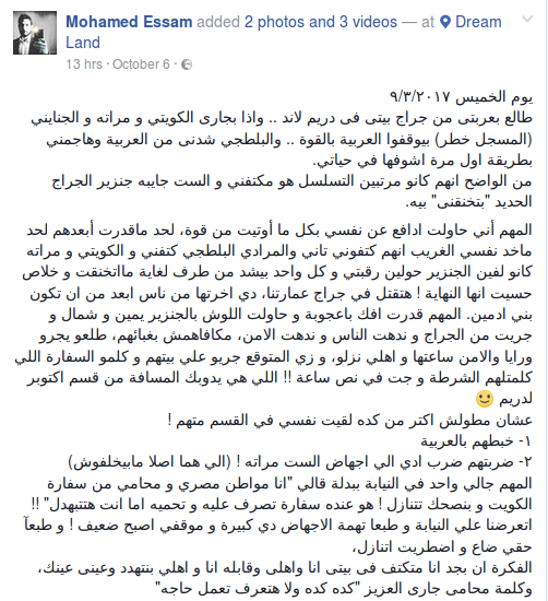 وكتب “عصام” عبر حسابه الشخصي على موقع التواصل الاجتماعي “فيس بوك”: “يوم الخميس ?/?/???? طالع بعربيتي من جراج بيتي في دريم لاند.. وإذا بجاري الكويتي ومراته والجنايني (المسجل خطر) بيوقفوا العربية بالقوة.. والبلطجي شدني من العربية وهاجمني بطريقة أول مرة أشوفها في حياتي.. من الواضح إنهم كانوا مرتبين التسلسل هو مكتفني والست جايبة جنزير الجراج الحديد “بتخنقني” بيه”.
