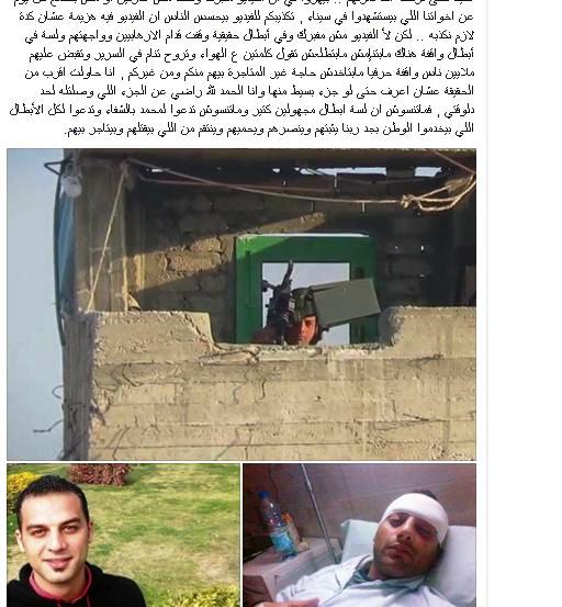 أنا مبسوط جداً اني اتكلمت مع محمد واتطمنت عليه محمد مصاب بشظايا في الوجه والعين أثرت على النظر , خرج قريب من المستشفى وبيتلقى العلاج في البيت فياريت كلنا ندعيله ربنا يتم شفاه على خير هو بيقولي عندي استعداد ارجع وأقف في نفس المكان تاني واخدم الوطن.