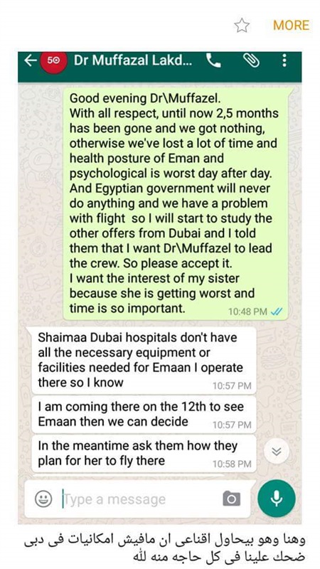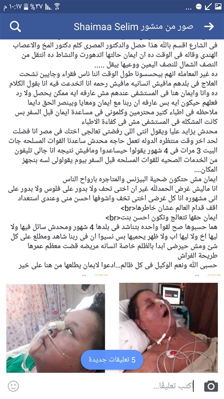 وأكدت أنها تواصلت مع طبيب مصري في الهند وحضر ليرى حالة «إيمان»، وفي المستشفى هددوها بأن يلقوا شقيقتها في الشارع إذا تحدث للصحافة والإعلام.