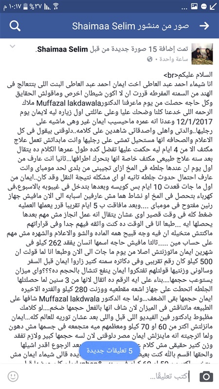 وأكدت أنها طالبته بعدم سفر «إيمان» إلى مصر في الوقت الحالي لأن وزنها ما زال ضخما، أكد لها أن وزنها لن ينقص سوى 50 أو 60 كيلو في سنة.