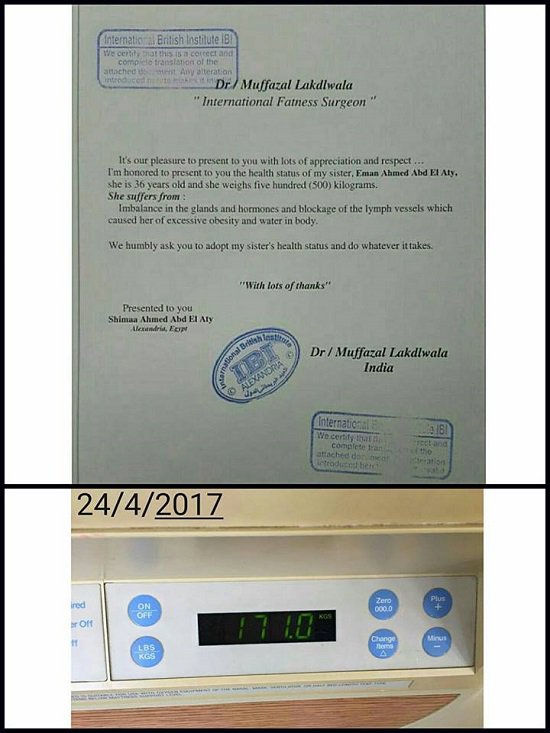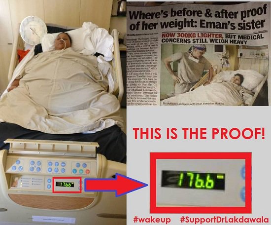 وأثبت الدكتور موفازال لاكدويلا بحسب ما ذكرته صحيفة “zeenews” الهندية على موقعها الإلكترونى، أن إيمان فقدت الوزن فعلا وأصبحت تزن حاليا 171 كيلو جراما، من خلال تصوير الميزان الملحق بسريرها ونشر الصورة لوسائل الإعلام، مؤكدا أن ما فعلته شقيقة إيمان هو قتل للإنسانية، وأنه سيستمر فى المساعدة والدعاء بالشفاء إيمان.