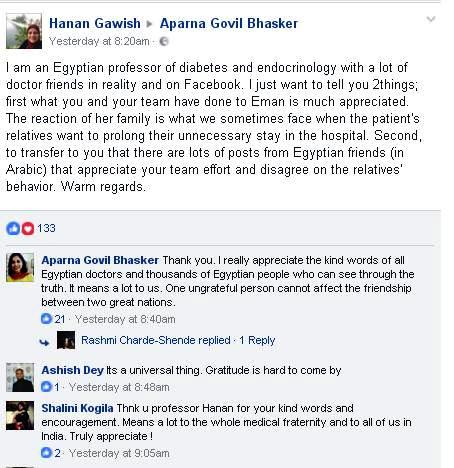 حيث أبدت الدكتوره حنان جاويش أستاذ امراض السكر والغدد الصماء اعتذارها لاطباء الهند وقدمت لهم التحيه لما بذلوه من مجهودات تجاه حالة إيمان مؤكده بأن الأطباء المصريون عانوا الكثير من أسره إيمان