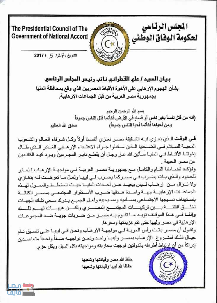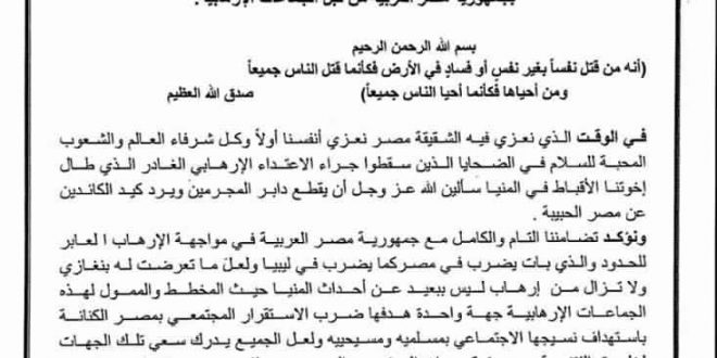 وأوضح القطراني في بيانه الرسمي أن مصر هي رأس الحربة التي تواجه الارهاب، مشيرا إلى أن ليبيا تعلم تماما ما تقوم به مصر وبتنسيق تام حيال هذا الامر، مشيرا إلى أنه لابد من الوقوف صفا واحدا لمواجهة الإرهاب بكل السبل .