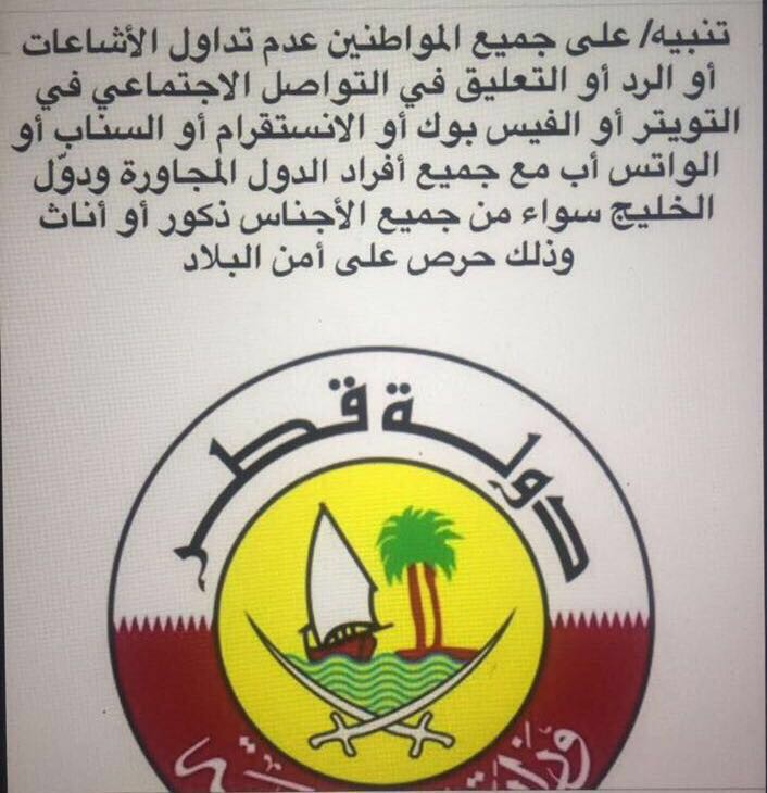 تداول نشطاء مواقع التواصل الاجتماعي، من المقيمين في قطر، نشرة تم توزيعها على المقيمين من قبل وزارة الداخلية القطرية، حثتهم فيها على الحفاظ على هدوئهم، وعدم كتابة تعليقات ضد أي حكومة من شأنها التشهير.