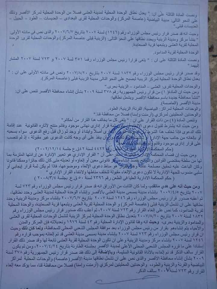 *ومن حيث انه صدر قرار رئيس مجلس الوزراء رقم 1246 لسنة 2007 بتاريخ 7/6/2007 والذى نص فى مادته الاولى على :-” ينشأ مركز ومدينة الزينية ويحدد نطاقها على النحو التالى :الزينية قبلى عاصمة المركز” والوحدات المحلية لقرى الوحدة المحلية لقرية العشى ويتبعها قرية الصعايدة . الوحدة المحلية لقرية المدامود