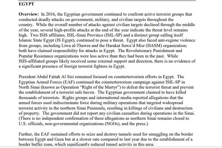 أصدرت الخارجية الأمريكية بيانها لعام 2017 عن الإرهاب في العالم الأربعاء، تحدثت خلاله عن الأوضاع الأمنية في مصر خلال العام الماضي 2016، والتي رأت أن مستوى التهديد فيها -مصر- ظل مرتفعا بعد أن شن متطرفون عدة هجمات على أهداف حكومية وعسكرية ومدنية.