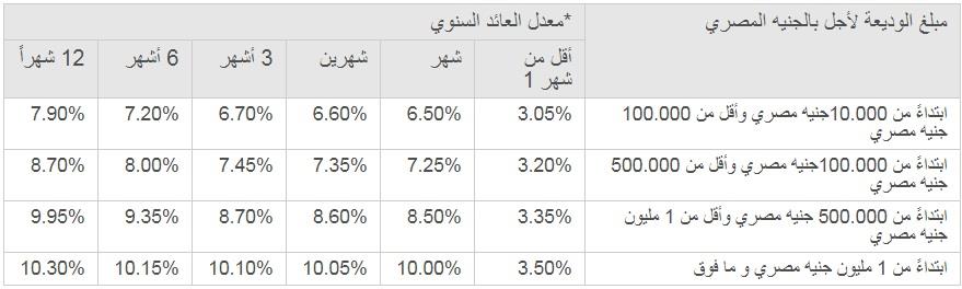 تبلغ الفائدة 5.25% على الوديعة من أسبوع إلى أقل من 15 يوما، و5.5% من 15 يوما لأقل من شهر، و7.25% من شهر إلى شهرين، و8.25% على الوديعة الربع سنوية، و8.5% النصف سنوية، و9% السنوية.