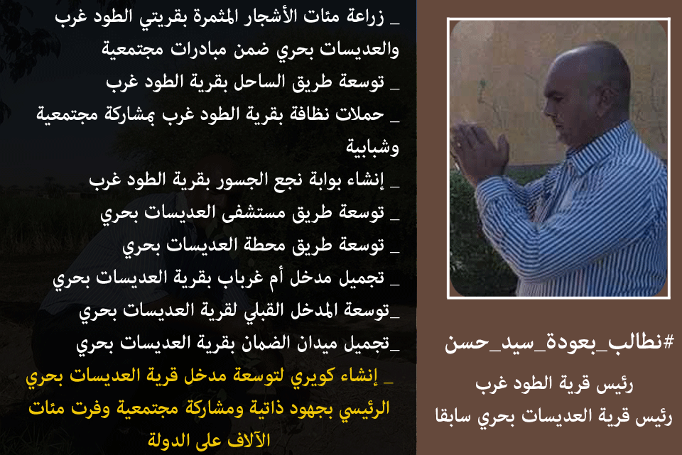 شباب العديسات بحرى وقبلى والطود تقدموا بالعديد من الشكاوى والطلبات للمحافظ بعودة الأستاذ سيد حسن محمود لرئاسة الوحدة المحلية لقرية العديسات بحرى او اى وحدة محلية بمركز الطود للاستفادة من نشاطه وهمته العالية فى العمل .