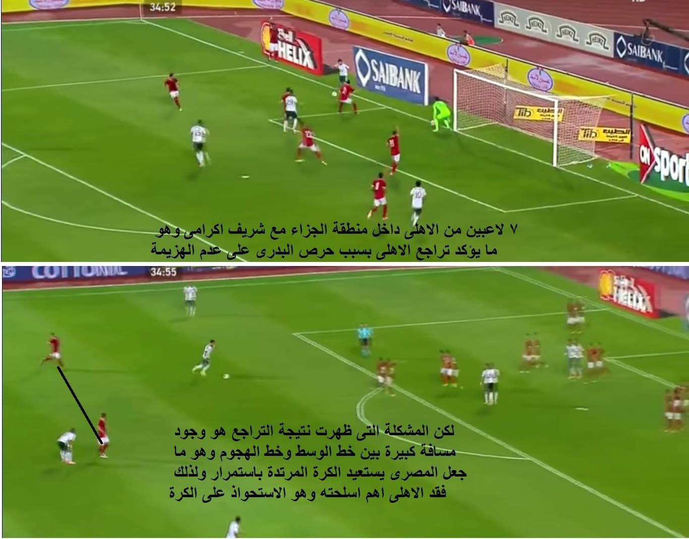فى المقابل نفس الشيء من حسام حسن الذى حاول اغلاق المساحات الكبيرة فى دفاعه وهو ما جعله يفقد اهم قدرات فريقه هو الضغط المبكر على دفاع ووسط اى فريق يقابله وهى ايضا اكبر مشاكل الاهلى .المباراة شهدت تحفظ دفاعى كبير من الفريقين وكان الخوف من الخسارة يسيطر على كلا المدربين اكثر من محاولات الفوز ، لذلك شاهدنا شوطين فقيرين جدا فى عدد الهجمات وحتى التغييرات ايضا كانت متأخرة جدا .حسام حسن اجبر على التغيير الاول بعد اصابة احمد ايمن منصور -الذى نتمنى له الشفاء العاجل- واضطر حسام حسن لرجوع عمرو موسى للخلف ونزول عبدالله بيكا فى الوسط والغريب ان البدرى لم يحاول استغلال ماحدث ويضغط اكثر على المصرى والاستحواذ على الوسط وهذا مايؤكد ان الكل كان يخشى الخسارة اكثر من اى شيء اخر .اما البدرى فقام بنزول صالح بدلا من وليد وتبع هذا التغيير تعديل فى طريقة اللعب وتحولت الطريقة من 4-2-3-1 الى 4-3-3 وهو ما اعطى شيء من الاستحواذ للاهلى ولم تم الاعتناء اكثر بانهاء الهجمات من مهاجمى الاهلى لاستطاع الاهلى حسم اللقب قبل الدخول فى الاشواط الاضافية .فى الاشواط الاضافية استمر نفس الامر لكلا المدربين ولكن حسام حسن اعطى قليل من الحرية للاعبى الوسط للتقدم من اجل استغلال التراجع الكبير والغير مبرر من لاعبى الاهلى داخل منطقة جزائهم وهو ما استغله عبد الله بيكا واحرز هدف اكثر من رائع بعد تسديدة قوية من خارج منطقة الجزاء بعد ان استلم الكرة دون اى ضغط .بعد الهدف بدأ لاعبى فى التحرر من الخوف من الخسارة واصبح الفريق مجبر على التقدم من اجل احراز التعادل فاعتمد الاهلى على لعب الكرات الطولية والتى لم تخدم الفريق فى اول الشوط الاضافى الثانى ولكن نجح الاهلى فى الدقائق الاخيرة من احراز هدف التعادل بعد عرضية مثالية من ركلة حرة نفذها معلول بامتياز واسكنها عمرو جمال الكرة بضربة رأس رائعة . وفى الدقائق الاخيرة قام حسان حسن بالخطأ الوحيد له فى المباراة بعد ان اندفع 6 لاعبين فى كرة ثابتة وترك مساحات كبيرة فى الدفاع فى ظل عدم قدرة لاعبيه على الارتداد للدفاع وكان العقاب سريع من فتحى بعد تحول مثالى من الحالة الدفاعية للحالة الهجومية واستطاع تسجيل هدف بمنتهى الهدوء .اخيرا البدرى استحق الفوز بالكأس بعد الاداء الكبير للفريق تحت ولايته على مدار الموسم وفى المقابل ايضا حسام حسن لا يستحق الخسارة بعد المستوى الكبير الذى قدمه الفريق طوال الموسم .مبروك لجمهور الاهلى ومبروك للمنظومة الرياضية الانجح فى الوطن العربى .