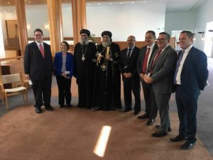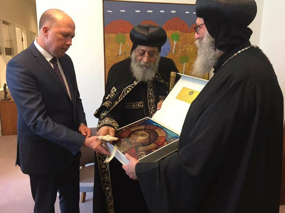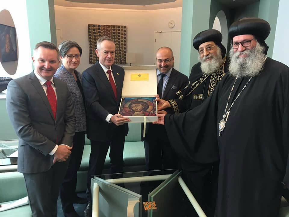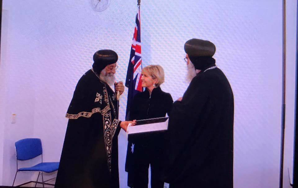 فى زيارة تاريخية لقداسة البابا تواضروس الثانى الاسكندرية وبطريارك الكرازة المرقسية والوفد المرافق له لكامبرا العاصمة الفيدرالية الاسترالية برفقة نيافة الحبر الجليل الانبا سوريال أسقف ملبورن وتوابها والسفير المصرى محمد خيرت لدى كامبرا التقى صباح اليوم الأربعاء رئيس الوزراء الاسترالى السيد مالكوم ترنينبول وزعيم المعارضة السيد بيل شورتون كذلك العديد من الوزارء ومنهم السيدة جولي بيشوب وزيرة الخارجية والسيد بيتر دوتون وزير الهجرة وبعض أعضاء البرلمان الفيدالى منهم السيد بيتر خليل اول عضو برلمان فيدرالى قبطى كما التقى أيضاً السيد أستيفن بارى رئيس مجلس الشيوخ .