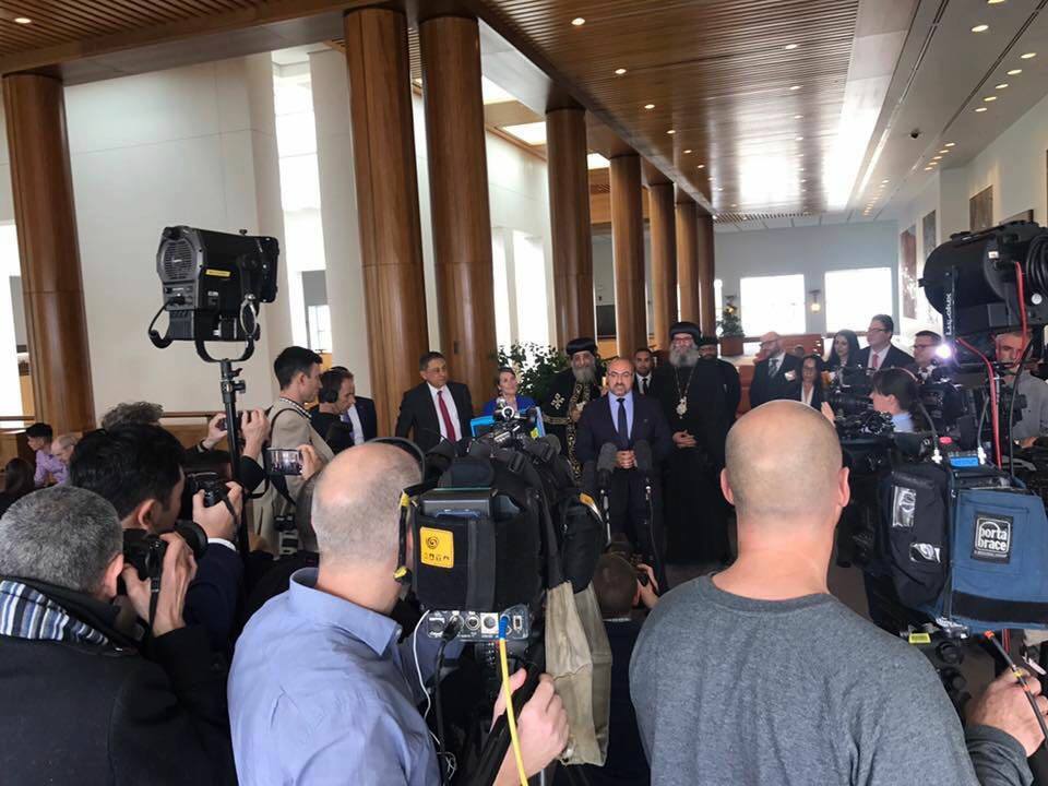 هذا وقد عقد قداسة البابا تواضروس مؤتمراً صحفياً داخل البرلمان الفيدالى أعقبة حفل غذاء اعده البرلمان ومما يذكر ان قداسة البابا والوفد المرافق له وصل مطار كامبرا امس قادماً من سيدنى بصحبة الانبا سوريال حيث كان فى أستقباله العديد من أبناء الجالية القبطية والكهنة يتقدمهم السيد محمد خيرت السفير المصرى لدى كامبرا .