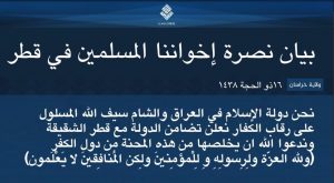 وأصدر تنظيم داعش الإرهابى بيان تحت عنوان “بيان نصرة إخواننا المسلمين فى قطر” أكد فيه تضامنه مع دولة قطر فيما وصفه بـ”المحنة من دول الكفر”.