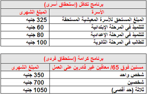 - يمنح برنامج تكافل وكرامة دعم شهري قيمة 350 جنيها لفئة كبار السن 65 عام، ولمن لديهم إعاقة تمنعهم عن العمل أو من لدية عجز كلى.