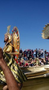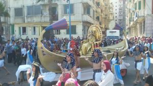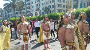 بدأ الاحتفال بالموسيقى الفرعونية الحماسية و بإعلان خروج الملكة المصرية من داخل معبدها، ويخرج من خلف ستار المعبد اثنان من الضباط بالشعلات النارية، يليهما خروج اثنين من الضباط حاملين البوق الفرعونى الطويل، و بدأ الستار بالانفتاح ويمتلئ المدخل بدخان كثيف ليخرج من خلاله الموكب الملكى مصحوبا بالموسيقى الفرعونية التي يستقبلها جموع شعب مصر بالتصفيق، حتى يمر الموكب من أمام نادى اليخت المصرى في منطقة المنشية ثم تظهر الملكة كليوباترا بزيها الفرعوني