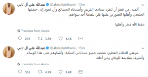 كما نقلت الصحيفة عن الشيخ عبد الله آل ثاني قوله يجب “على قطر أن تعود لحضنها الخليجي، وأتمنى من قطر أن تطرد صيادي الفرص وأصدقاء المصالح”.