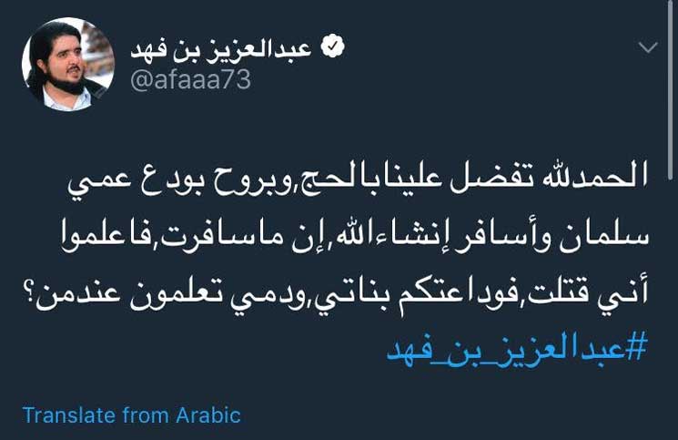 وقال الأمير في تغريدة أطلقها على موقع “تويتر” للتواصل الاجتماعي فجر اليوم أنه بعد أن قام بأداء الحج، سيذهب ليودع عمه الملك سلمان بن عبد العزيز، ويسافر، دون أن يحدد موعدا واضحا للسفر، وما إذا كان سيسافر في إجازة أم سيغادر المملكة. وأضاف الأمير عبد العزيز، أنه في حال عدم مغادرته فقد يتعرض للإغتيال.