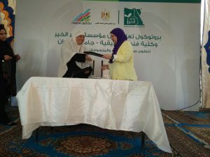 وحضر توقيع البروتوكول كل من سهير عوض مدير برنامج الغارمين بمؤسسة مصر الخير، والدكتورة غالية الشناوي رئيس قسم الغزل والنسيج بكلية فنون تطبيقية جامعة حلوان، والدكتورة ميرفت عبد الفتاح الرئيس الأسبق قسم الغزل والنسيج بكلية فنون تطبيقية جامعة حلوان، والدكتور طارق عبد الرحمن استاذ نظريات التصميم والتريكو بكلية الفنون التطبيقية جامعة حلوان، والدكتور محمد ضرغام أستاذ تكنولوجيا أليات النسيج بكلية الفنون التطبيقية جامعة حلوان، والدكتور أسامة القبيسي أستاذ رياضيات النسيج بقسم الغزل والنسيج بالكلية.