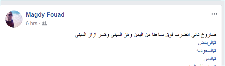قال احد شهود العيان المصري المقيم بالرياض ان الصاروخ الذي أطلقته القوات الحوثية علي العاصمة السعودية الريضا كان له أثر بالغ علي المباني مما تسبب في تحطيم نوافذ زجاجية للمباني وكاد ان يدمر مباني لولا إعتراض القوات الجوية السعودية للصاروخ وتمكنت من تدميره في الهواء قبل وصوله للعاصمة وإحداث خسائر كبيرة.