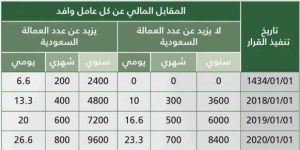 وكشفت الوثيقة عن جدول يوضح رسوم #المقابل المالي المطلوبة عن كل عامل وافد حسب القرارات الوزارية المتعلقة بهذا الأمر، وأوضحت تواريخ تطبيق المقابل المالي المطلوب عن كل عامل عند إصدار أو تجديد رخصة عمله.