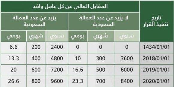 ووفقاً للقواعد يتم دفع 100 ريال سعودي عن كل عامل وافد، وذلك مقابل رخصة العمل لمدة سنة، كما يتم تطبيق مبدأ السنة المالية على الأرقام الموحدة من بداية تطبيق القرار.
