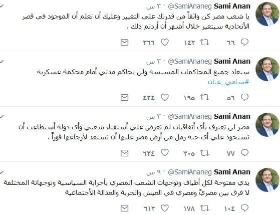 كما قام الفريق بكتابة تغريدات أخرى مؤكداً من خلالها أنه سوف يتم إعادة جميع المحاكمات السياسية، ولن يتم محاكمة المدنين في محاكم عسكرية، كما أنه أكد على أن الدولة المصرية لن تعترف باي اتفاقات تمت دون استفتاء شعبي، وأن أي دولة حصلت على حبة رمل من مصر عليها أن تستعد لإرجاعها