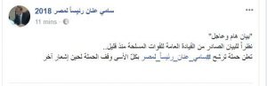وذكر الحساب الرسمي للحملة، عبر موقع التواصل الاجتماعي “فيس بوك” :” نظراً للبيان الصادر من القيادة العامة للقوات المسلحة منذ قليل..تعلن حملة ترشح سامي عنان رئيسا لمصر، وقف عمل الحملة لحين إشعار آخر.