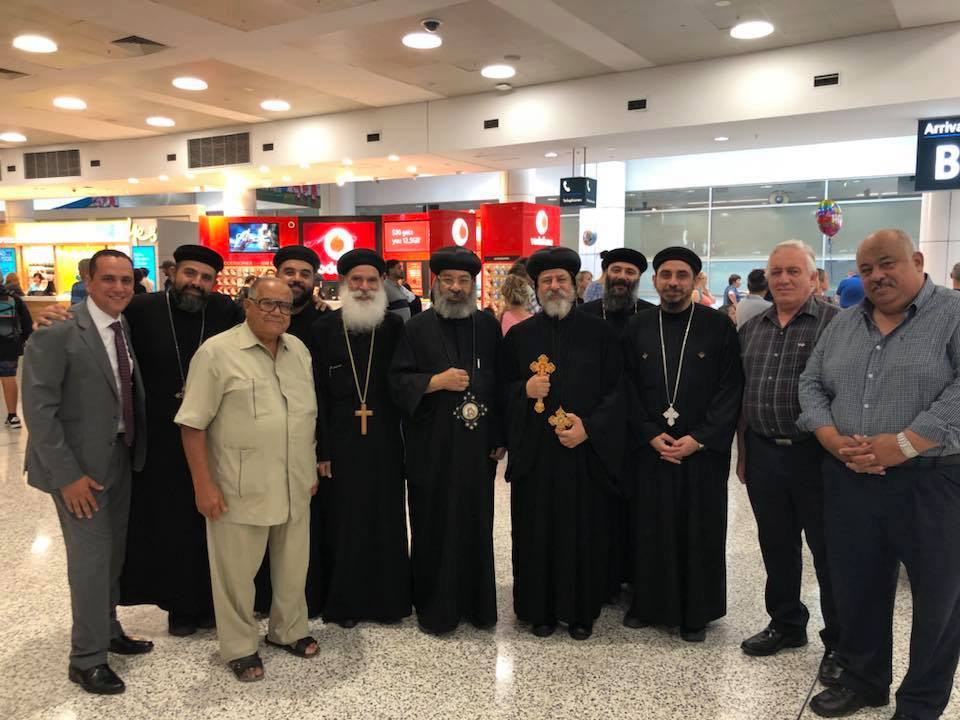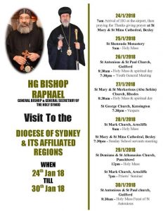 وصل صباح اليوم الأربعاء قادماً من القاهرة نيافة الحبر الجليل الأنبا رافائيل الأسقف العام لكنائس وسط القاهرة وسكرتير المجمع المقدس مطار سيدنى الدولى فى زيارة رعوية يقود خلالها العديد من القداسات والاجتماعات الروحية يتخللها المشاركة فى مؤتمر الاسرة الروحى والذى يدور حول موضوع ( وهو مات لأجل الجميع كى يعيش الأحياء فيما بعد لا لأنفسهم , بل للذى مات لأجلهم وقام . )