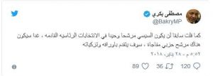 كما قلت سابقا لن يكون السيسي مرشحا وحيدا في الانتخابات الرئاسيه القادمه ، غدا سيكون هناك مرشح حزبي مفاجاة ، سوف يتقدم باوراقه وتزكياته كامله كمرشح منافس للسيسي