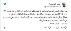 وكتب «عمار» عبر حسابه على موقع التغريدات القصيرة «تويتر» :« حين يطلب السيسي تفويضا جديدا فهو لا يقصد قطعا نزول الناس إلى الشارع على طريقة 26 يوليو 2013، فهو يعرف جيدا أن هذا لن يلقى استجابة عريضة مثلما كان، وإن لقي فإن مخاطره على السلطة ستكون قوية، إنما هو يقصد دعوة الناس للمشاركة بغزارة في الانتخابات في ظل مخاوف شديدة من ضعف الإقبال»