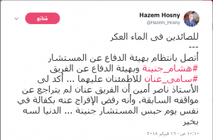 وكتب “حازم حسني” عبر حسابه على موقع التواصل الاجتماعي “فيس بوك”: “للصائدين فى الماء العكر.. أتصل بانتظام بهيئة الدفاع عن المستشار هشام جنينة وبهيئة الدفاع عن الفريق سامى عنان للاطمئنان عليهما … أكد لى الأستاذ ناصر أمين أن الفريق عنان لم يتراجع عن مواقفه السابقة، وأنه رفض الإفراج عنه بكفالة في نفس يوم حبس المستشار جنينة … الدنيا لسه بخير.”